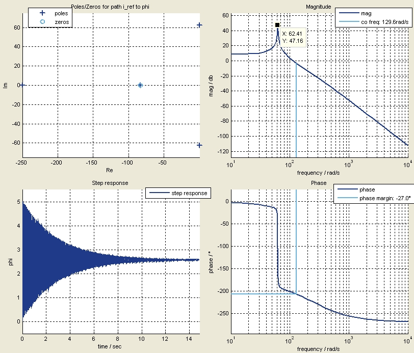 Im Anhang habe ich eine kleine Analyse meiner Regelstrecke für den Lageregler hinterlegt: Also mein bereits Stromgeregeltes Modell, dass auf dem Pfad I_soll (Ausgang des Lagereglers) nach Phi (also dem Winkel) untersucht wurde. Zu sehen sind die Pol-Nullstellen-Karte, das Bode-Diagramm (Amplitude/Phase) und die Sprungantwort.