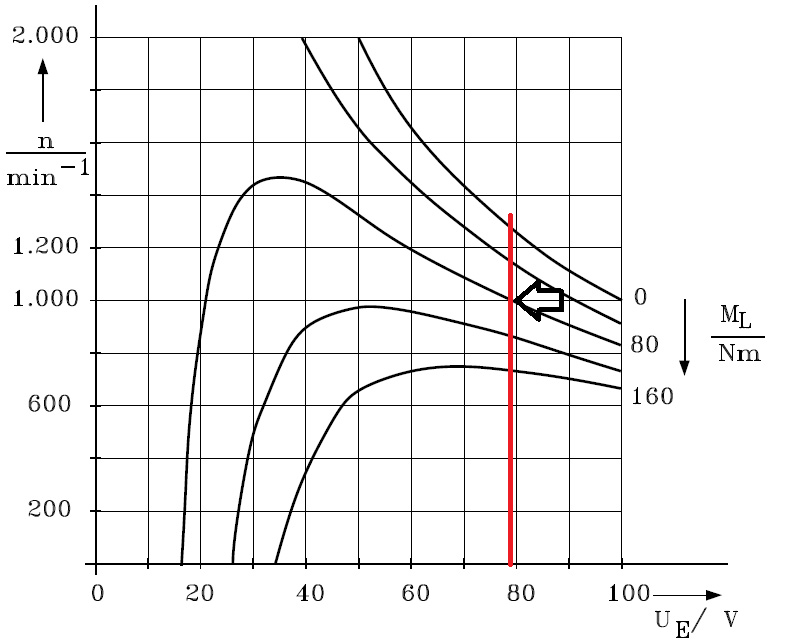 Die Drehzahl n hängt von der Erregerspannung Ue und dem Lastmoment ML nach folgender Beziehung ab.