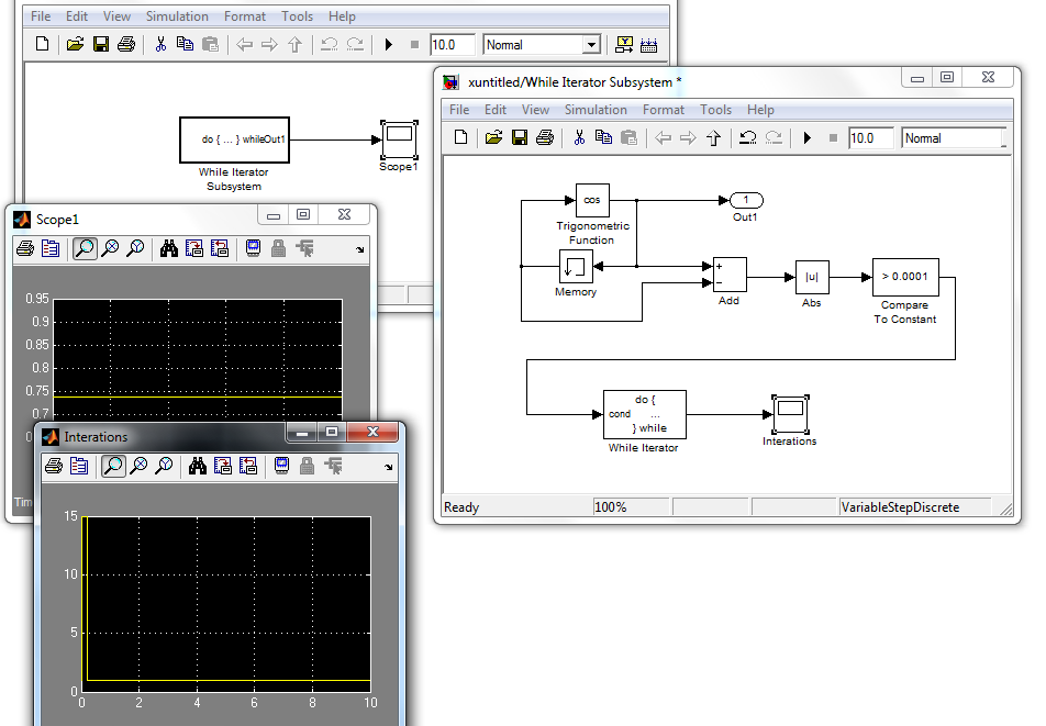 Als ein Beispiel habe ich wieder eine Funktion x = cos(x) benutzt. Das Signal "x" muss man über einen Delay-Block oder Memory-Block abkoppeln. Mit dem Block "Add" und "Abs" berechne ich nun die Endkondition und das alles läuft im "While Iterator Subsystem" als "do-while".