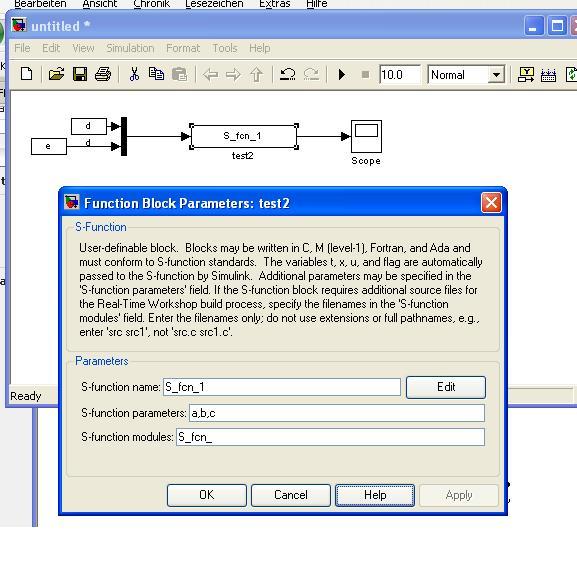 ich hab ne c-mex S-function, die bekommt im Modell 2 Eingangssignale, und hat aber als Parameter noch zusätzlich Vektoren und Matrizen, die ich per Doppelklick auf den Block einstelle, und dann mittels define am Anfang des C-Files per