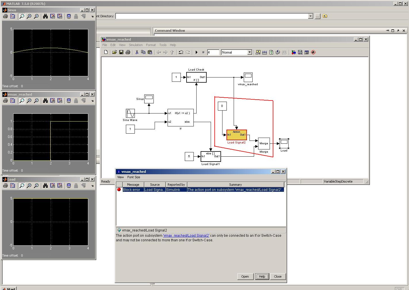 Wie man in den Scopes sieht, funktioniert das auch bis dahin einwandfrei. Allerdings nur ohne das was im roten Kasten ist wenn das Loadsignal direkt auf das Scope gegeben wird. Das ist dann natürlich konstant bei 5. Und die Ausganslinien von dem If-Block sind keine Volllinien mehr, sondern Strichpunktierte.