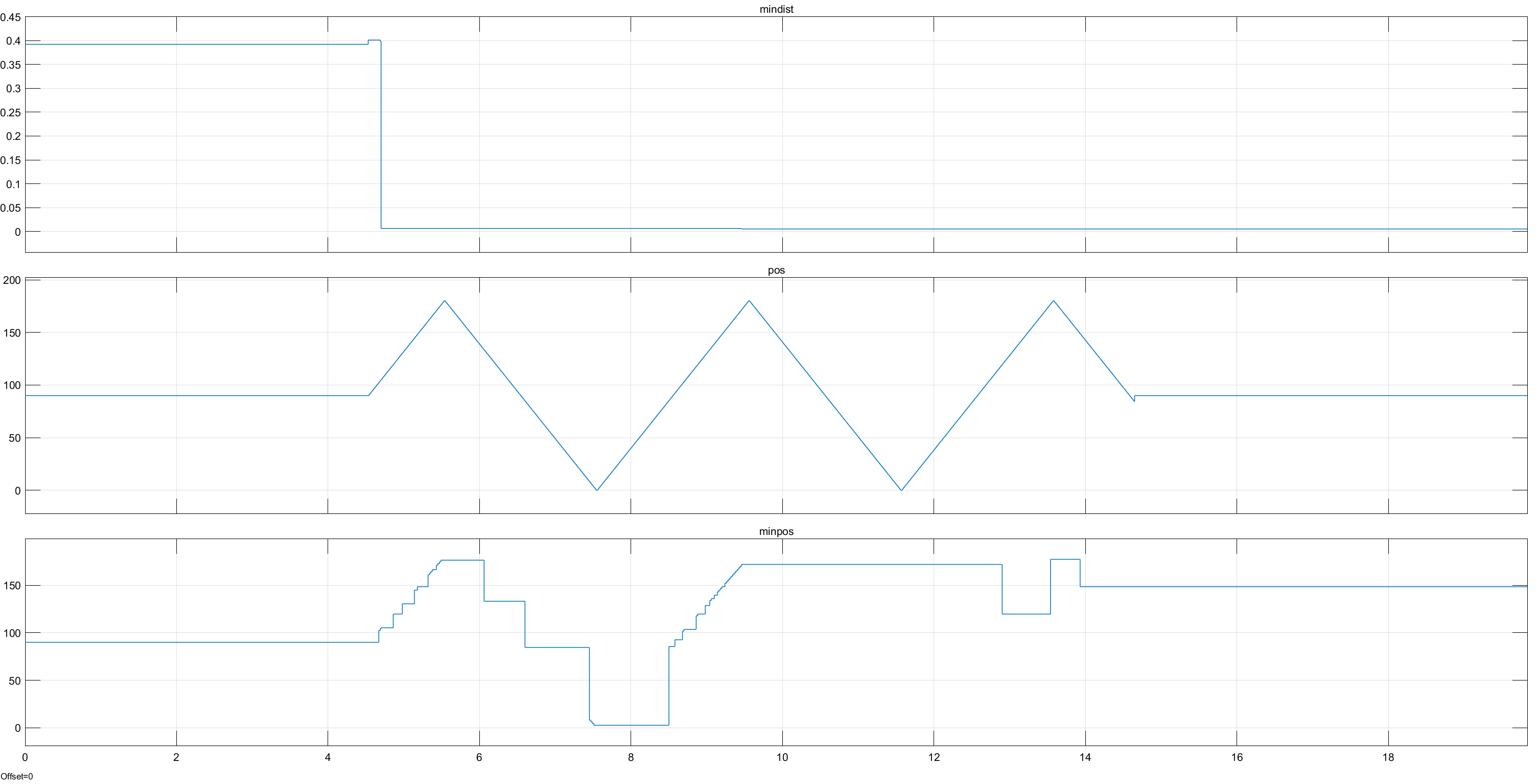 ich habe die Signalausgabe angehängt. Die minimale Distanz bleibt wie gewollt beim gleichen kleinen Wert, allerdings die dazugehörige Position (Signal minpos) nicht. Das Signal pos ist das Quellsignal von minpos. Die Berechnung dazu habe ich auch hochgeladen.