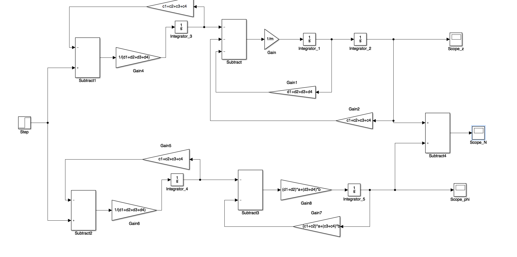 Eine Koppelung der beiden Freiheitsgrade liegt vor. Ich verstehe aber trotzdem nicht, wie ich das mit einer solchen Schleifen aufbauen kann. Für einen Freiheitsgrad und eine Masse ist das verständlich, weil quasi jede Größe in der Schleife integriert und dann wieder aufsummiert wird. Wie soll ich nun aber in diese Schleife eine andere Größe, wie z.B. phi, einbauen? Die kann ich ja nicht einfach in die Integrationskette einbinden.