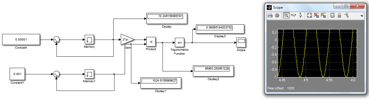 Ich habe die Simulation nach ca. 100 Sekunden gestoppt. Da komm ich dann auf die zu generierende Frequenz von ca. 10 Hz hin. Im Scope zeigt der Sinus jedoch eine Frequenz von ca. 20 Hz an.