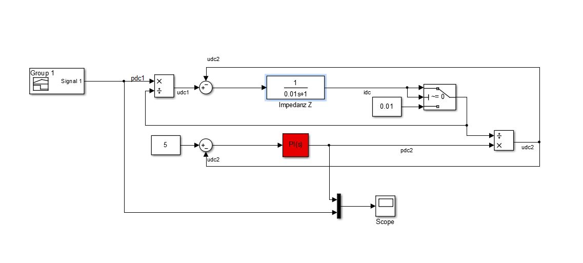 Im Grunde soll der PI Regler die Spannung udc2 in einem Gleichstromkreis konstant halten, während sich die Leistung pdc1 ändert. Somit soll eine ausgeglichene Leistungsbilanz von pdc1 pdc2 und der Verlustleistung über meiner Impedanz Z erreicht werden, ohne dass beide Stationen miteinander kommunizieren müssen.