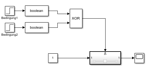 du könntest eventuell die beiden Signale mit einem XOR Glied verknüpfen, und in ein "enabled Subsystem" geben.