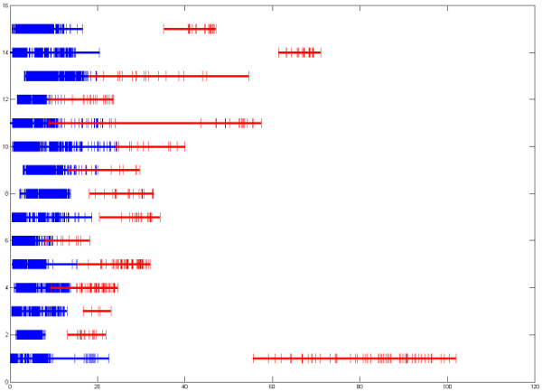 Ich habe zwei Intervalle für jedes Item und möchte diese gerne visualisieren, d.h. so, dass man direkt erkennen kann ob, und wie weit sich die entsprechenden Intervalle überlappen. Pro Diagramm kann es natürlich mehrere Items (maximal 15) geben.