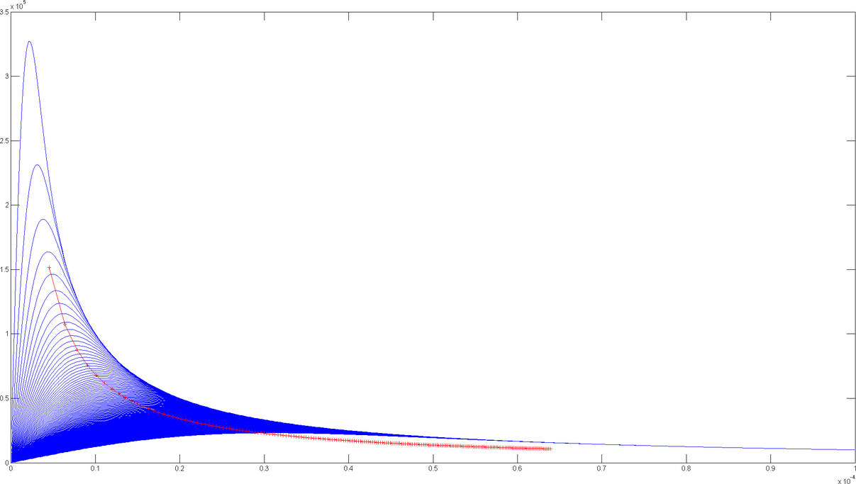 Unten habe ich noch mal das entschlackte Skript das ja eigentlich funktionieren sollte angefügt. Es wird neben der Kurvenschar u_sigma(r) auch die Lösungskurve u(rmax(sigma)) geplottet. Irgendwas stimmt aber mit der roten Lösungskurve immer noch nicht - sie liegt nicht auf den Maxima der blauen Kurvenschar sondern irgendwie verschoben (man beachte die ersten beiden +-markierten Punkte der roten Kurve) .... Ein Verwenden nur des abs()-Teils oder nur des real()-Teils verschiebt die Kurve aber auch nicht an die richtige Position