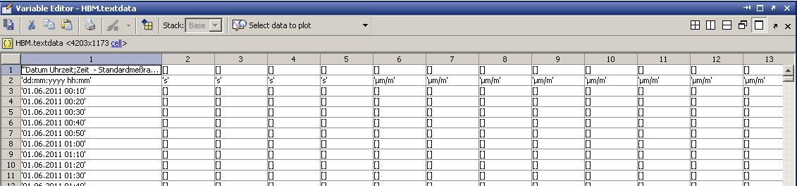 Derzeit wird die erste Zeile der Datei in eine Zelle eingelesen, also komplett alles in textdata{1,1}, alle anderen Elemente von Cell sind hingegen leer.