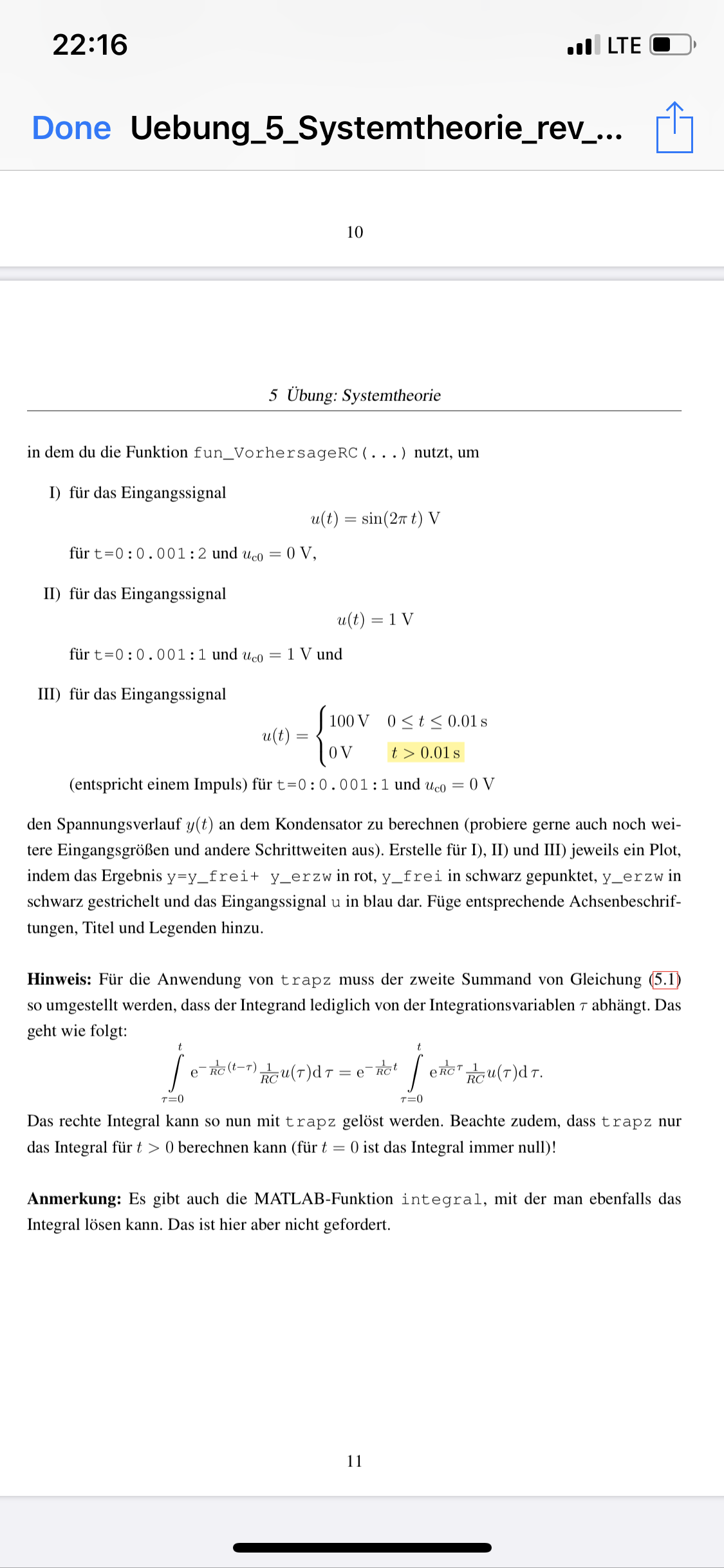 Ich übergebe einmal mein t, also meinen Zeitbereich. Dann übergebe ich das integral und multipliziere es dann nochmal mit dem, was vor dem integralzeichen steht. Es handelt sich dabei um das u(t) welches für jede teilaufgabe angegeben ist. Wie die Werte genau sein sollen, weiß ich nicht, unser Dozent hat nur gesagt, dass sie falsch seien. Wie würdest du das denn lösen? Gegebenenfalls direkt als Berechnung?