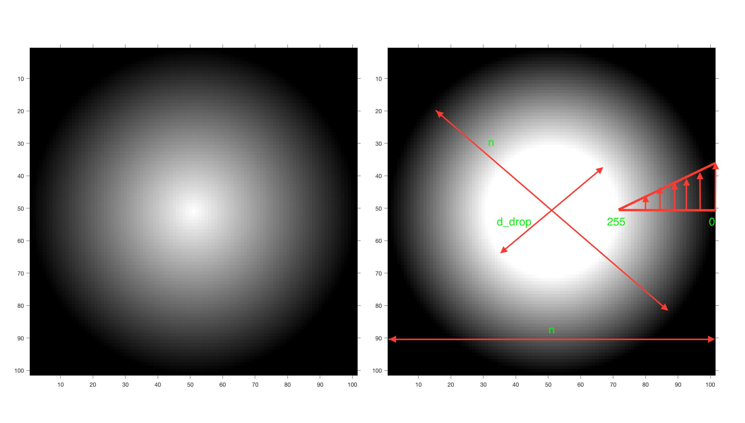ich würde gerne Folgendes realisieren. Durch den Code unten generiere ich einen Tropfen, siehe linkes Bild. In diesem Tropfen möchte ich nun den Tropfenkern, der im linkes Bild 1 Pixel groß ist, größer darstellen, sprich einen Tropfenkerndurchmesser angeben können. Der Tropfenkern selbst ist gänzlich weiß (Wert: 255). Ausgehend vom Rand dieses Tropfenkerns würde ich gerne bis zum Matrixrand einen (linearen) Abfall vom Wert 255 bis zum Wert 0 erhalten der einer Funktion folgt (linear, quadratisch, etc.). Aktuell kommt das rechte Bild raus. Da komme ich aber nicht weiter. Noch mal die einzelnen Punkte: