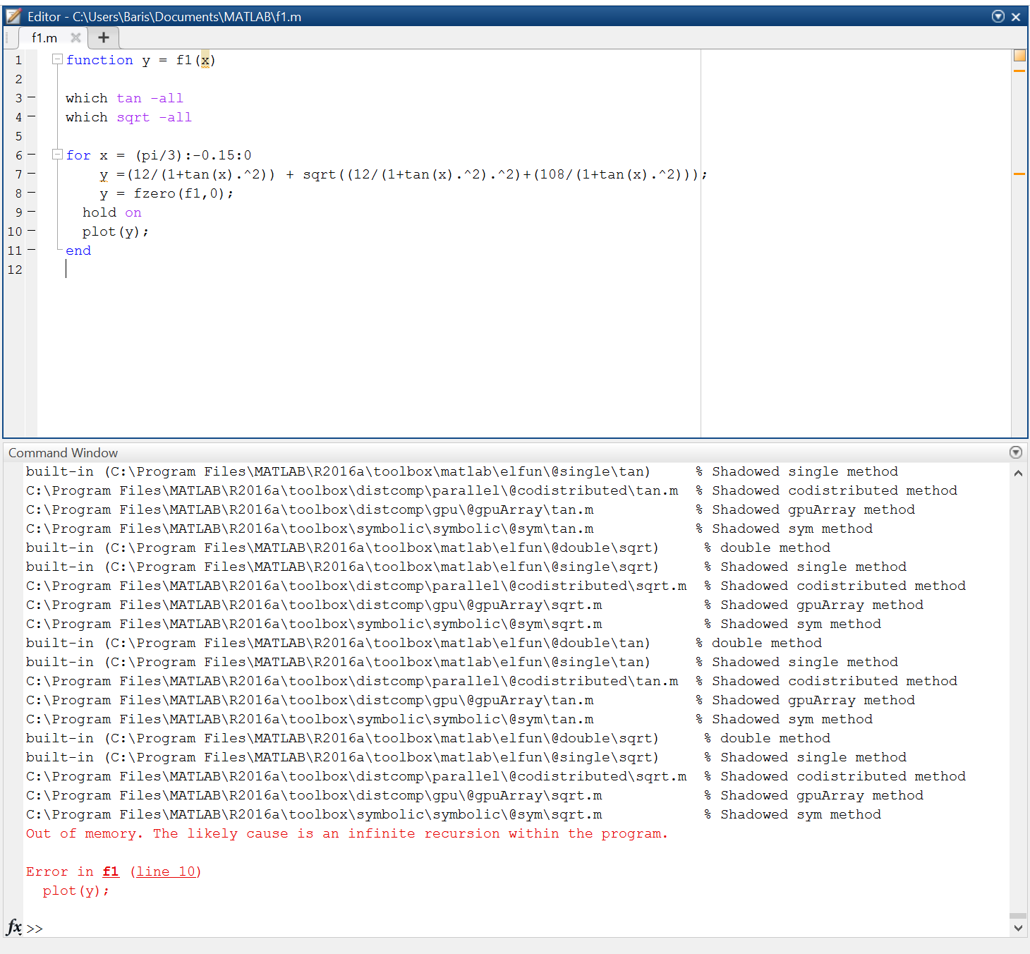 Die Funktion f1 ruft sich recursive selbst auf in (jetzt wäre es schön die Code-Zeile per Copy&Paste zu zeigen, aber wegen des Screenshots ist das umständlich) mit dem fzero Befehl.