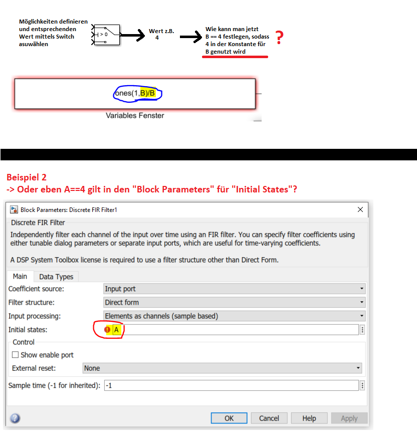 Dabei soll die jeweilige Variable NICHT im Base / Model Workspace definiert werden. Grund hierfür ist, dass sich der jeweilige Wert der Variablen in Abhängigkeit weiterer Bedingungen / Werte ändern soll.