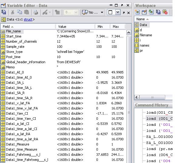 Ich empfehle also nochmal wärmstens ein Struct-Array zu verwenden. Das würde es später sehr einfach machen, wieder auf die einzelnen Werte zuzugreifen, Mittelwerte etc zu berechnen. Mit "Data1_time_Fahrtweg___s_I_0_1" wird Dir das nicht gelingen.