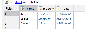 Also bspw. Time = S(1).data, Speed = S(2).data, usw.