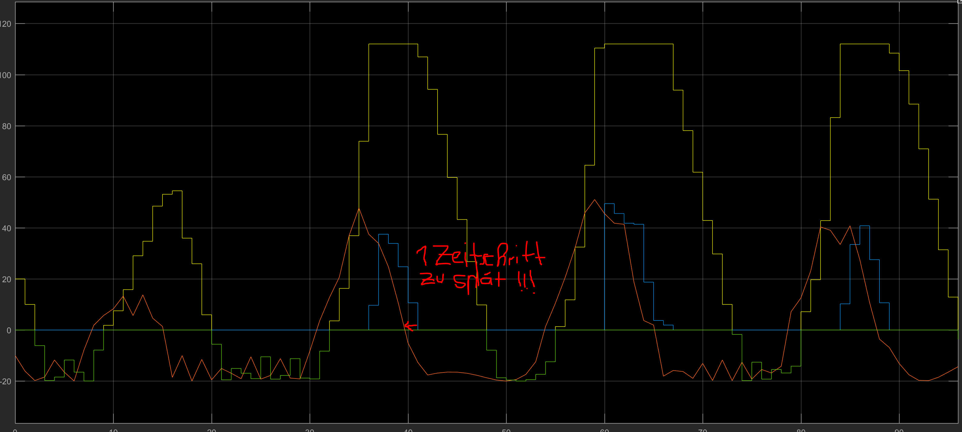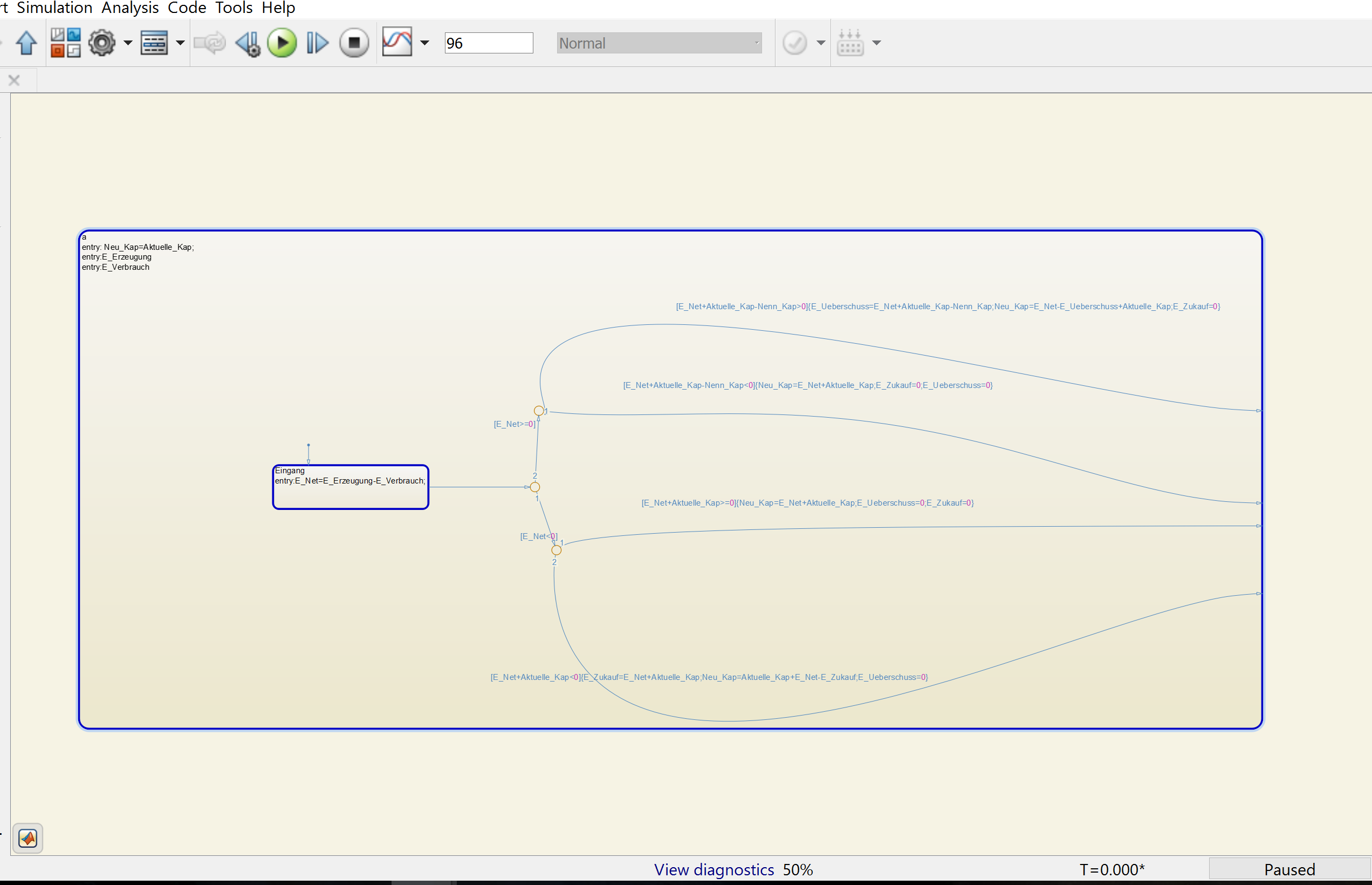 für unser Studienprojekt sollen wir die Kombination einer PV-Anlage mit einem Batteriespeicher simulieren. Nun wollen wir per Stateflow einen Zustand gleichzeitig mit den darauffolgenden Vorgängen ablaufen lassen und in einem Graphen darstellen lassen. Im Anhang seht ihr die Problematik