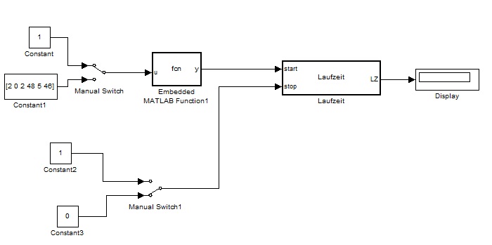 Der erste Embedded MatLab Block prüft nur, ob ein ankommendes Telegramm, in diesem Fall der Constant Block mit [2 0 2 48 5 46], einem bestimmten Wert entspricht. Der macht dann den ausgang zu 1 und geht in den Block Laufzeit.