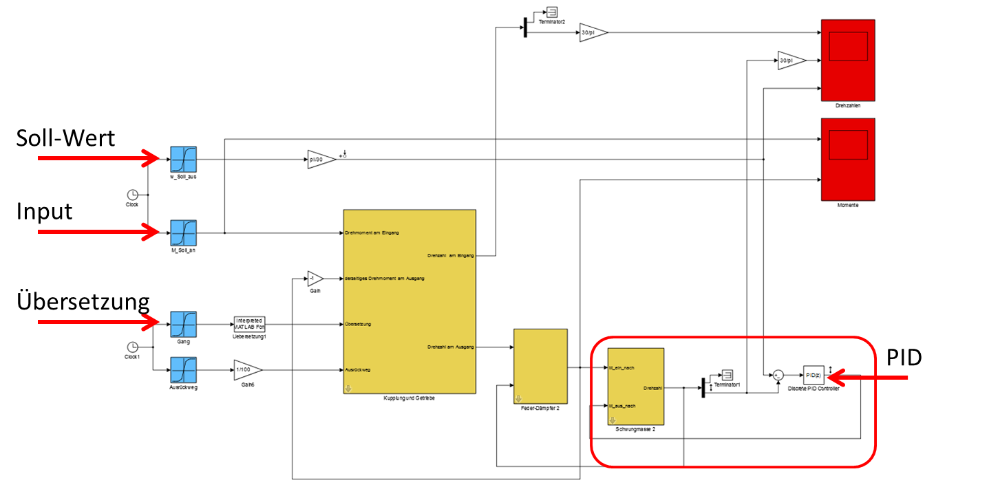 Ich soll ein Getriebe mit Kupplung und Abtriebswelle in Simulink modellieren. Zusätzlich soll die Drehzahl am Abtrieb auf einen Soll-Wert geregelt werden. Ich habe eine Bild des Aufbaus beigefügt. Es wird also ein Drehmoment gestellt und über Getriebe und Kupplung eine Drehzahl berechnet, die direkt nach dem Getriebe und der Kupplung anliegt. Hiernach kommt die Abtriebswelle, die über ein Feder-Dämpfer-Glied und eine Schwungmasse dargestellt wird. Hier befindet sich dann der Regelkreis, der auf eine Soll-Drehzahl regelt.