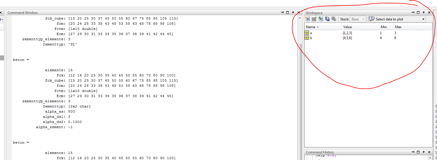 Rufe ich nun Funktionen in dem Cammandfenster auf werden alle Rückgabewerte im Workspace an gezeigt. Dies ist sehr praktisch, da ich nun sehe welche Werte nun wirklich in den einzelnen Variablen stehen.