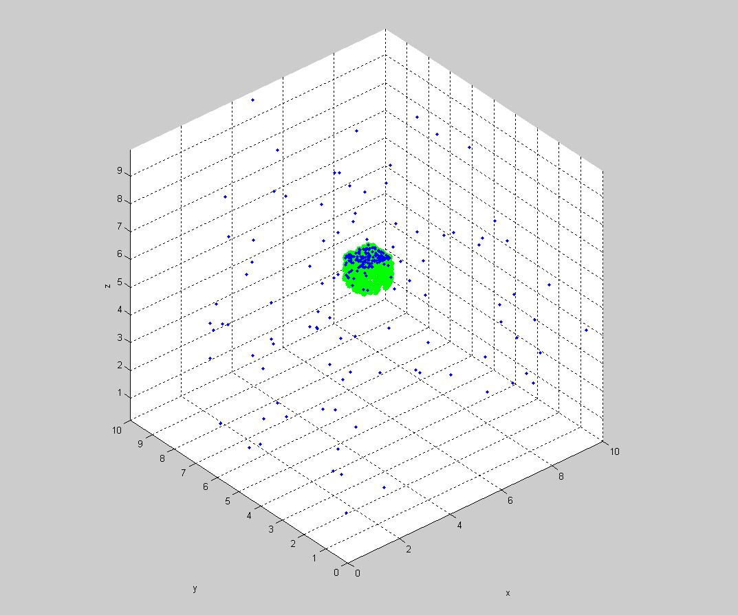 | Blau meine synthetischen Daten, grün die gefunden Ebenen. Gesucht Koords des Quaders und Abstände aller Punkte zur Oberfläche des Quaders |
