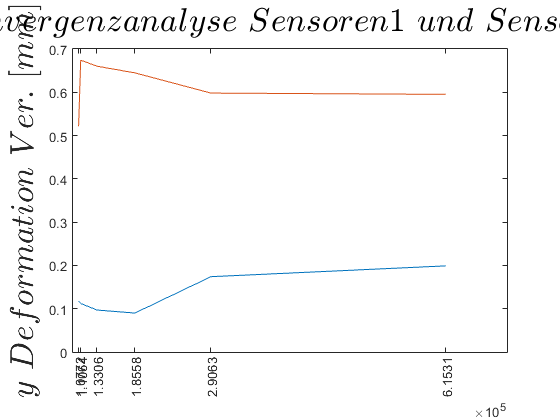 plot(x,z) plot(x,q) title('$Konvergenzanalyse~Sensoren1~und~Sensoren2$','Interpreter','latex','fontsize',25) ylabel('$y~Deformation~Ver.~[mm]$','Interpreter','latex','fontsize',25) set(gca,'xtick',x,'xticklabel',{'107722','','133062','','',''})