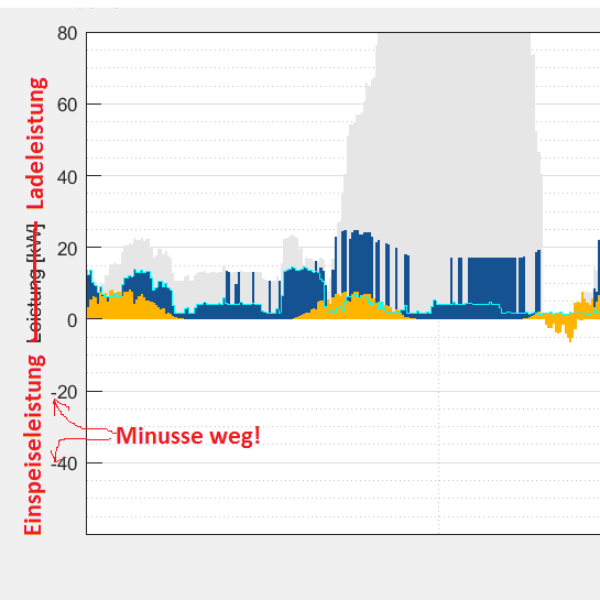 ich habe einen plot mit dem Befehl area erstellt, der im positiven Bereich der y-Achse die Ladeleistung und im negativen Bereich der y-Achse die Einspeiseleistung darstellt.