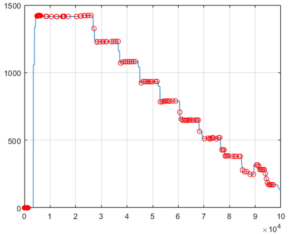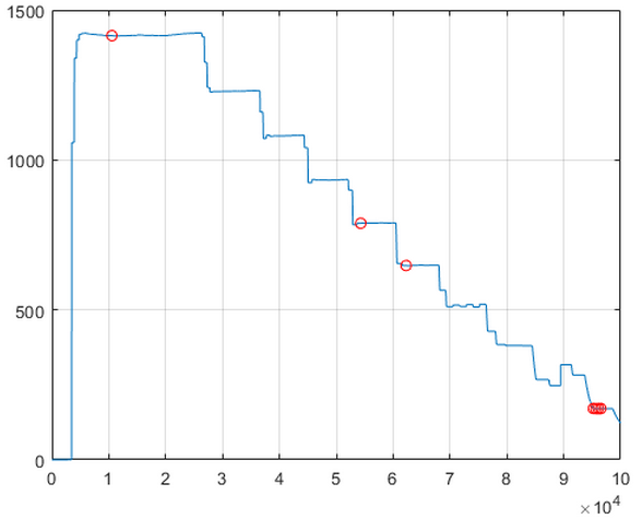 Ich brauche immer die Zeit für den Anfang und das Ende einer horizontalen Fläche. Wenn ich aber nur nach find(x>0) suche habe ich viel zu viele Punkte weil die Werte an diesen Stellen nicht zu 100% konstant verlaufen.