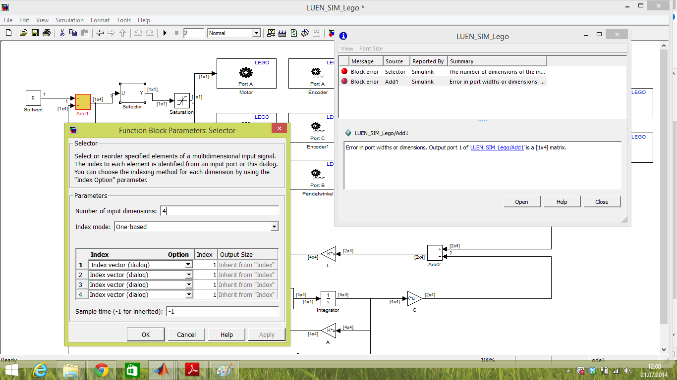Zudem wurde versucht, dass Vektorausgangssignal über einen Demux + Add Block in ein skalares Signal für die Motoransteuerung umsetzen. Aber das funktiniert nicht.