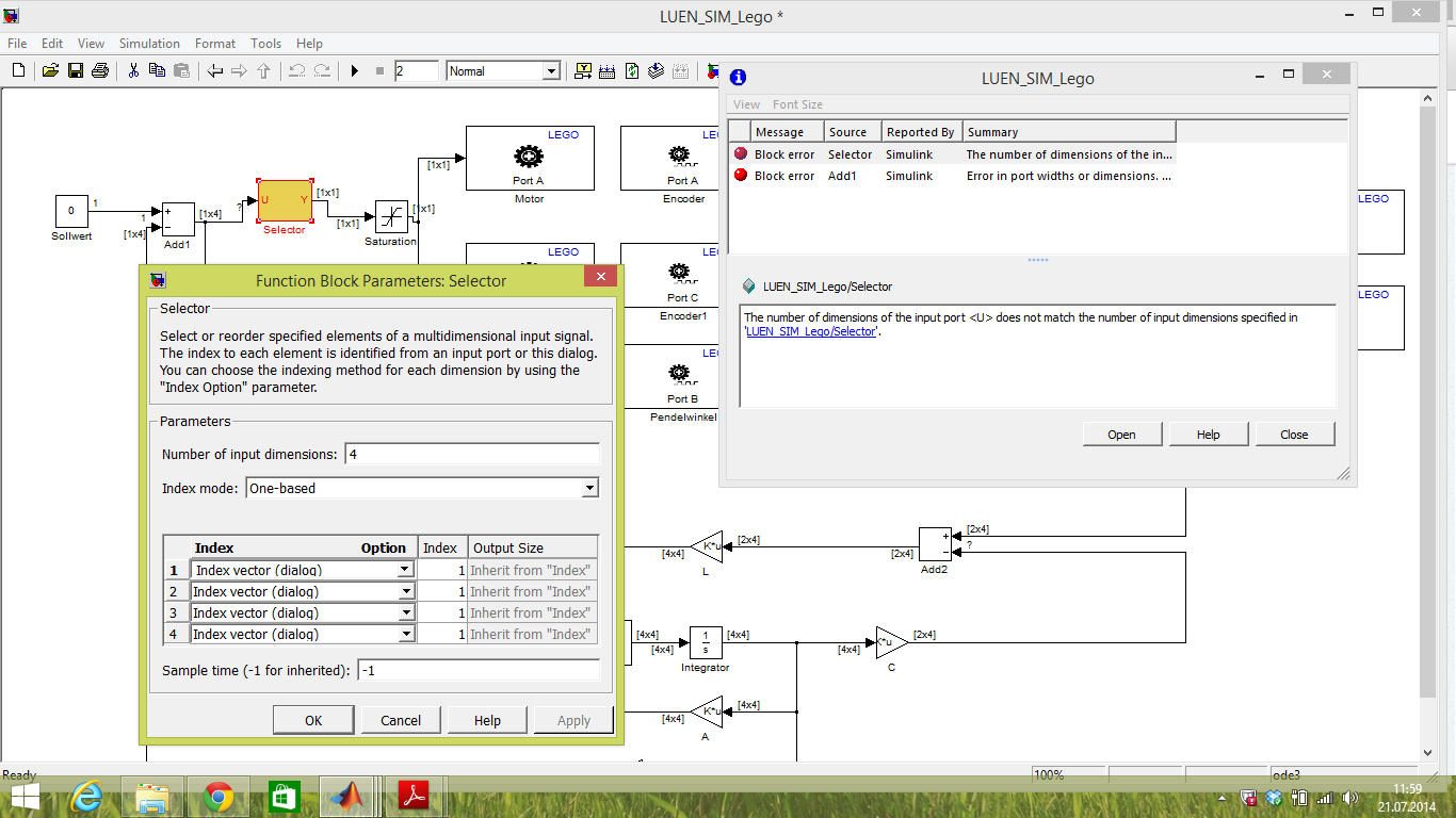 Dieser Vektor geht auf den Block Add2 . Der Minuseingang dieses Blocks ist einem Vektor ( Ausgang eines Beobachters belegt), siehe Anhang.