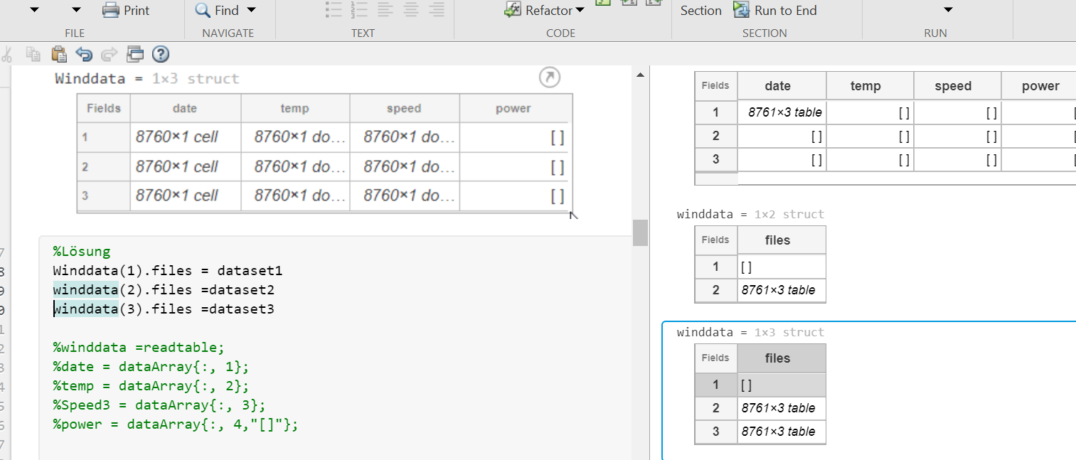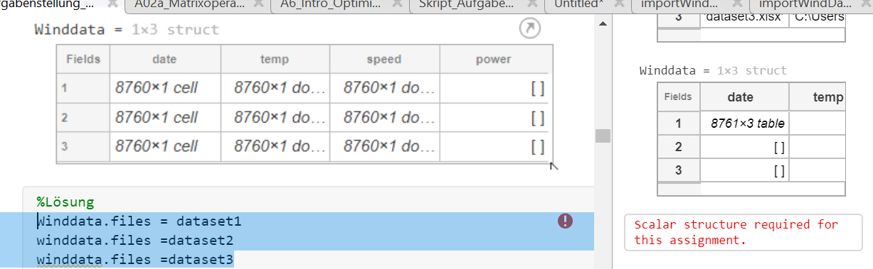 Nun muss ich die 3 vorhandenen Excelfiles dataset1-dataset3 importieren und in die Stuktur Winddata abspeichern.