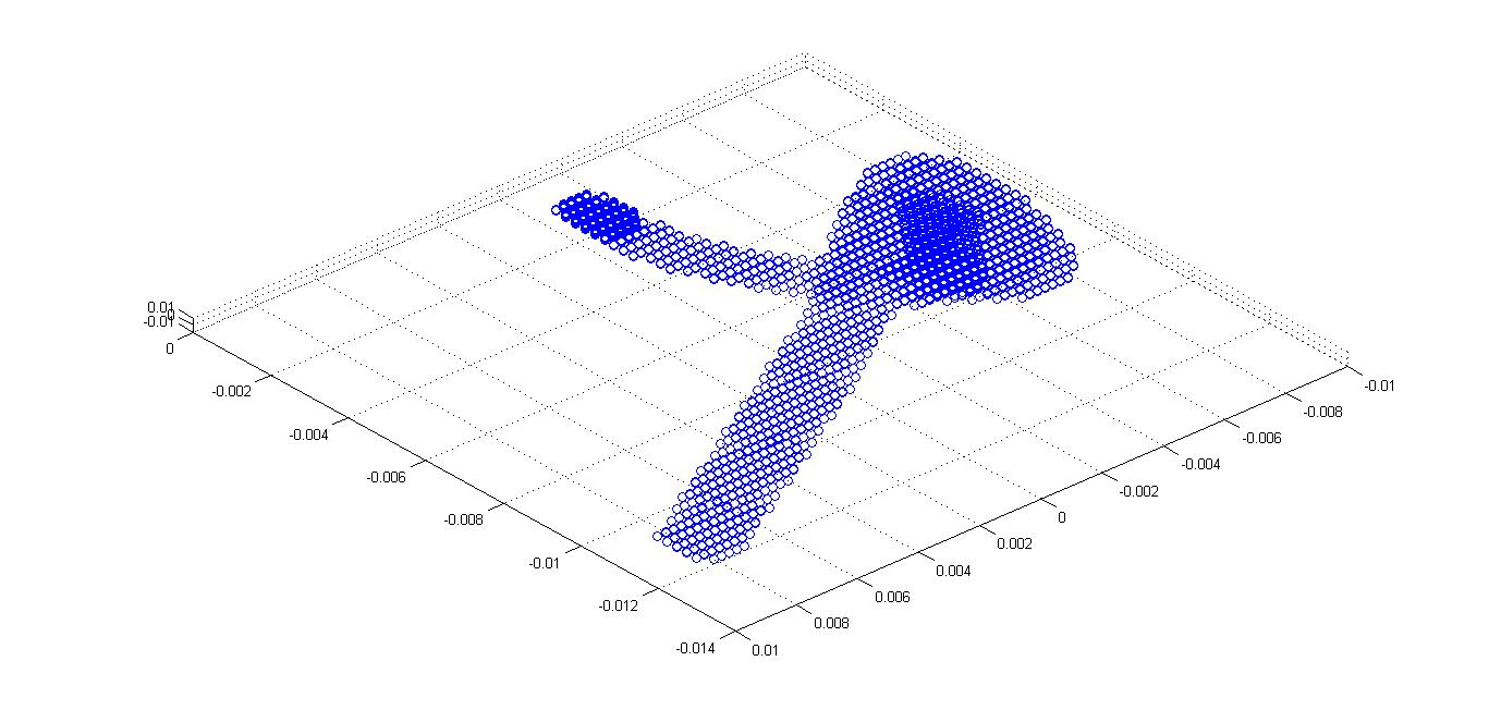 ich versuche derzeit, eine digitalisierte Geometrie eines Phantoms in MATLAB darzustellen. Dafür habe ich die jeweiligen x-,y-,z-Koordinaten identifiziert und kann diese auch wunderbar über scatter3 darstellen. Die entstehende Geometrie ist angehängt.