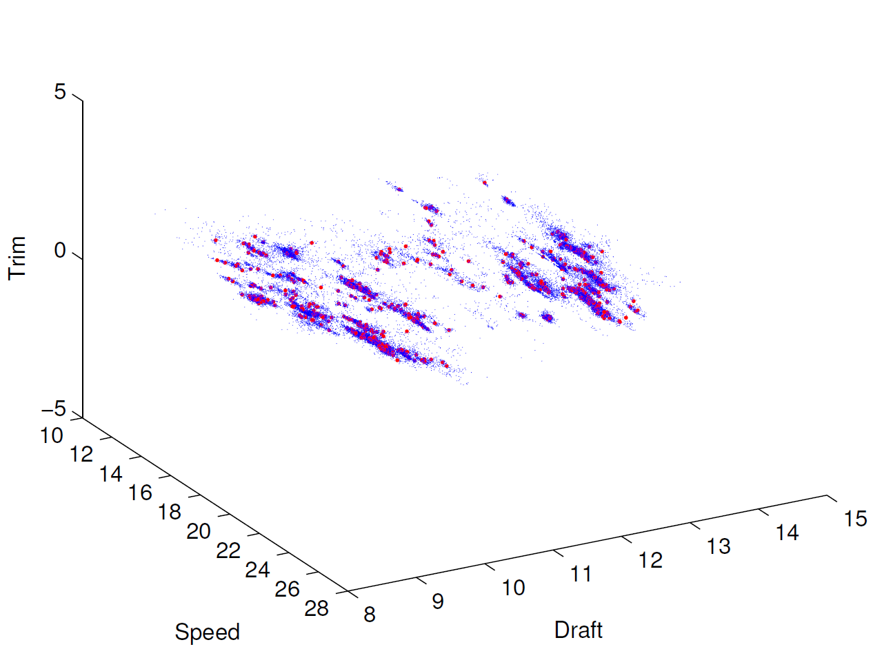 Ich bekomme als Ergebnis aus meinem Skript einen 3D Scatterplot (siehe Bild) In blau werden die Rohdaten dargestellt und in rot die nach verschiedenen Filter und Clusterverfahren übrigen Repräsentanten (um die geht es). ich wende das Skript über längere Zeit mehrmals auf den Eingangsdatensatz an, da sich dieser stetig vergrößert kommen auch immer mehr Punkte dazu und zwar in verschiedenen Raumkoordinaten.
