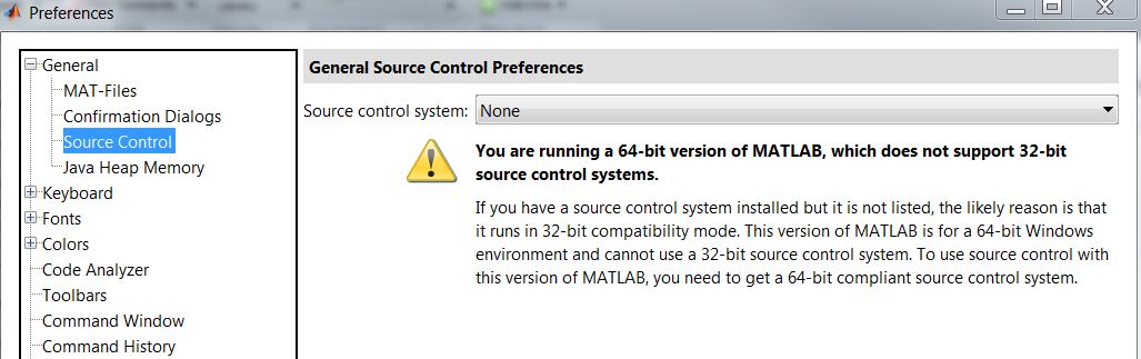 was bedeutet die Warnung: "You are running a 64-bit version of Matlab, which does not support 32-bit source control systems"?