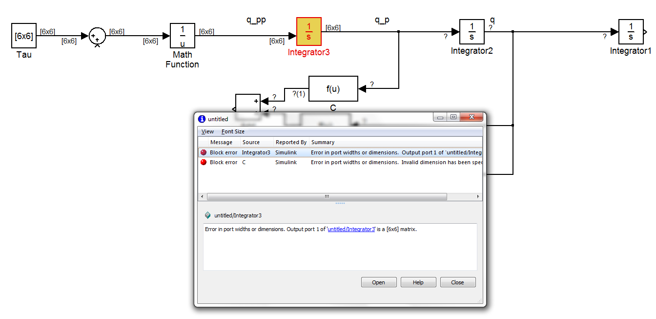 Error in port widths or dimensions. Output port 1 of 'untitled/Integrator3' is a [6x6] matrix.