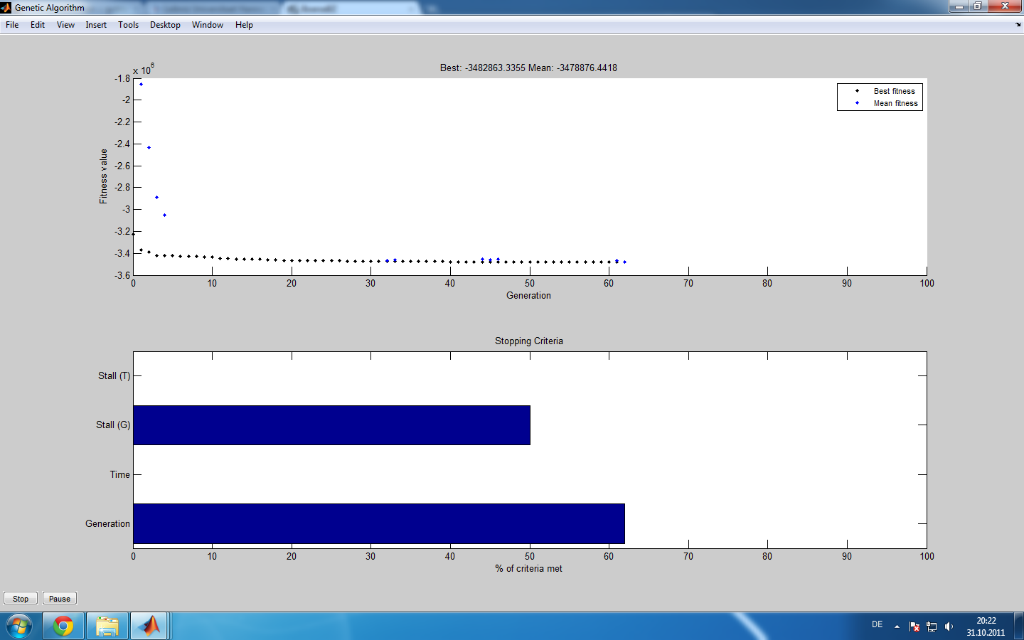 Jetzt bin ich etwas verwirrt, ich habe einen Funktion, die nach 62 Generationen abbricht. Im Anhang ist der Plot, den ich habe ausgeben lassen. Da steht ja sinngemäß, dass das StallGenLimit nicht erreicht wurde (50%) und trotzdem bekomme ich den Exitflag 1 (Optimization terminated: average change in the fitness value less than options.TolFun.)