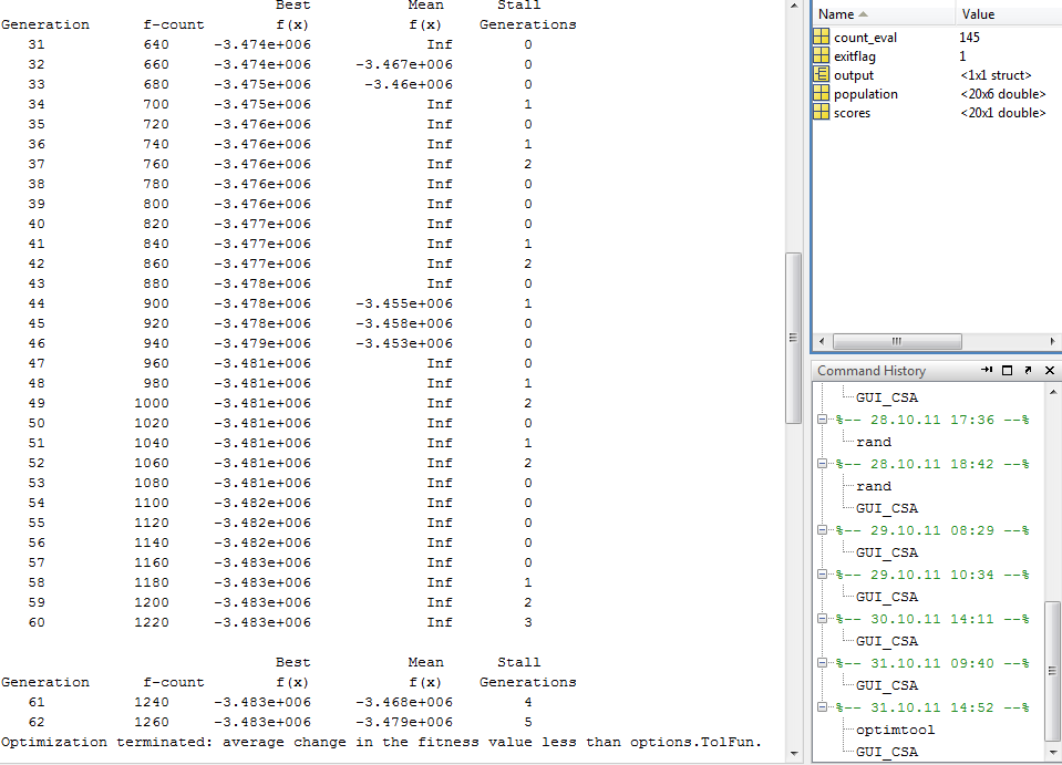 Ich vermute auch, dass der Exit-Flag genau dafür gedacht ist. Aber offenbar gibt es ein Problem. Ich kann es nicht versuchen, weil ich weder Deine Daten noch die GA-Toolbox habe. Du solltest aber den Grund für den erhaltenen Wert des Exit-Flag herausfinden können. Es könnte ja auch ein Bug in der Software sein. Das Debuggen zählt leider zu dem zu erwartenden Aufwand, wenn man programmiert.
