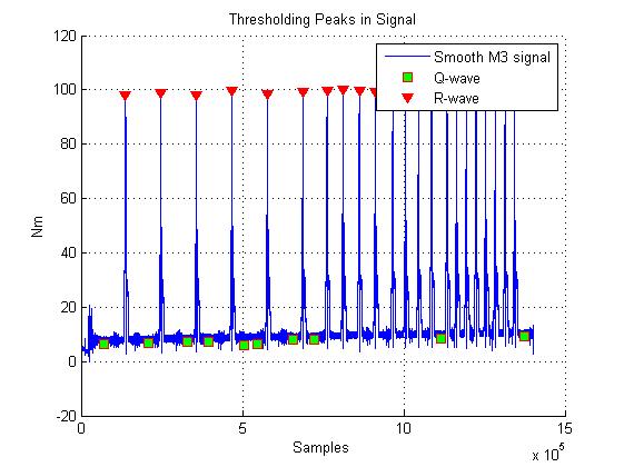 title('Thresholding Peaks in Signal') xlabel('Samples'); ylabel('Nm') legend('Smooth M3 signal','Q-wave','R-wave');