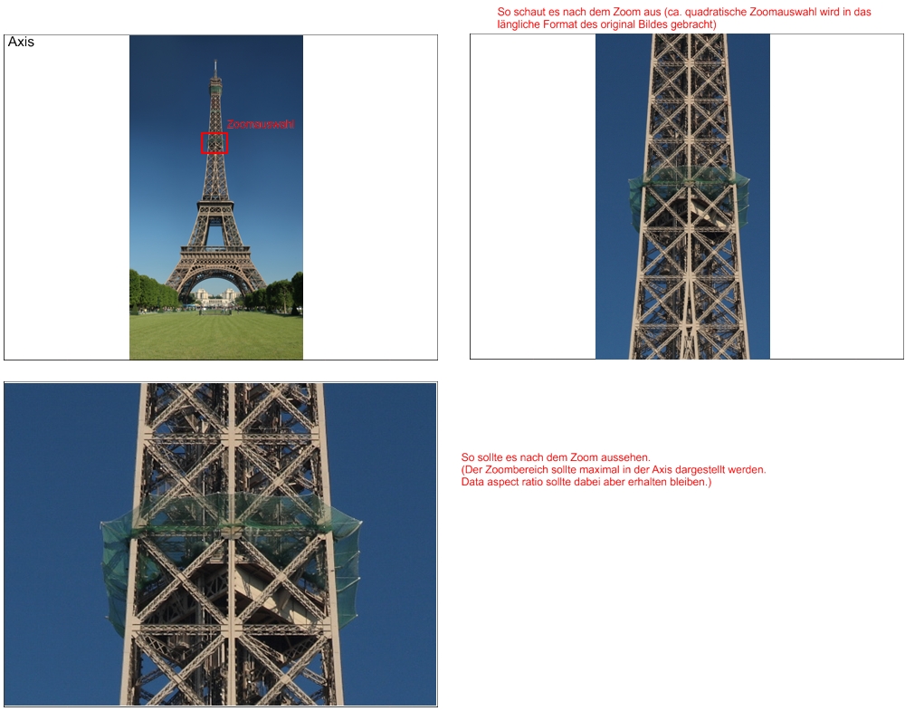 Ich bin mir aber nicht sicher ob wir das selbe meinen. Auf dem angehängten Bild sollen drei Beispielachsen dargestellt werden. Oben Links die Ausgangslage und mit rot markiert der Bereich der gezoomt werden soll. Rechts daneben ist die Achse wie sie nach dem Zoom ausschaut. Der quadratische Bereich der über die Zoom funktion (Maustaste gedrückt halten, Kasten aufziehen) ausgewählt wurde wird nicht in dem ganzen Bereich der Achse dargestellt sondern nur in dem Bereich der dem Format des original Bildes entspricht.