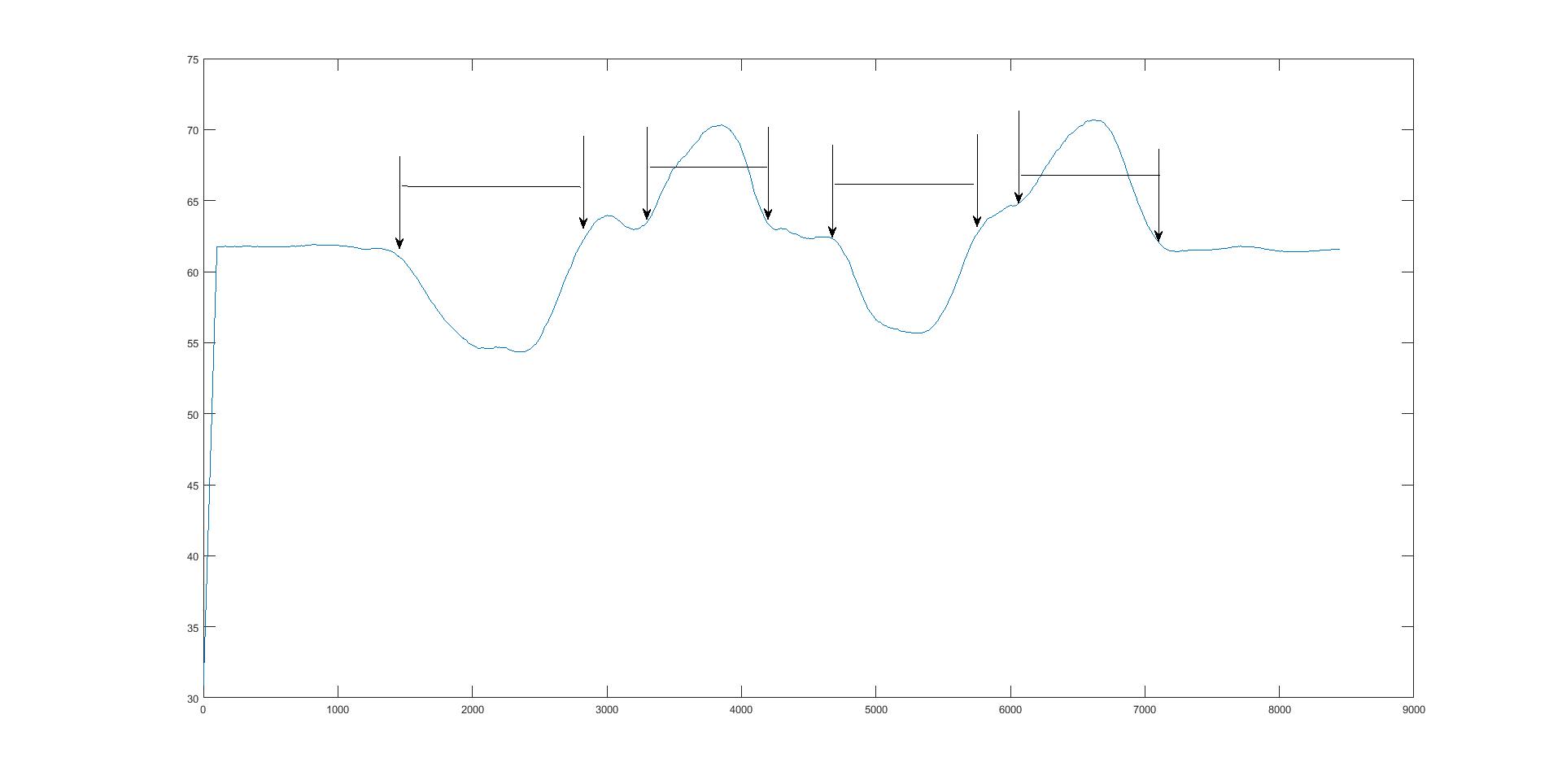 Im angehängten Bild seht ihr ein Kurvenverlauf (Lateralflexion ( seitneige)) der als bsp Dienen soll, Die Pfeile sollen Schnittpunkte sein und die Striche den Bereich markieren den ich am ende Brauche.