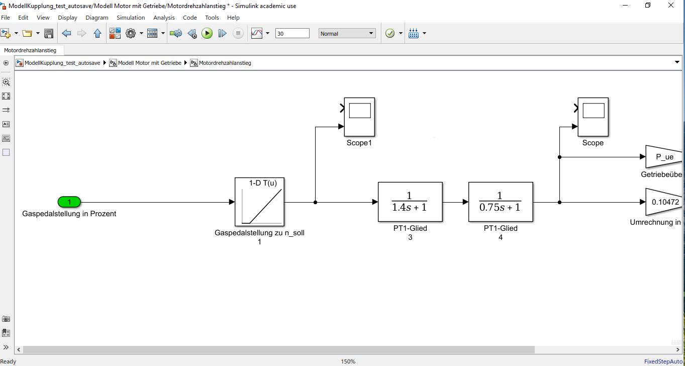 Das ist natürlich richtig. Jedoch benutze ich dieses Modell um das Verhalten eines Verbrennungsmotors nachzubilden. Der Motor ist ein Kartmotor und hat eine Fliehkraftkupplung welche nochmal an eine Lamellenkupplung gekoppelt ist. Dadurch habe ich am Ende des Powertrains ein fast konstantes Moment (durch das Durchrutschen der Lamellenkupplung) aber ein schwankende Drehzahl. Aufgrund dessen brauche ich einen Drehzahlanstieg des Motors vor der Kupplung als Eingangsgröße für mein Modell der Kupplung.