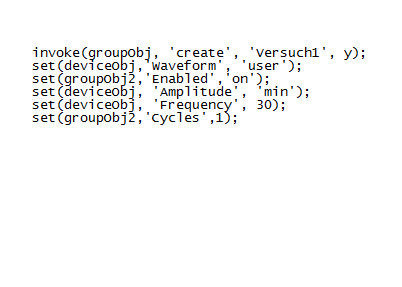Was die ersten 3 Zeilen machen weis ich nicht, ich kann damit auf jeden Fall nicht die Waveform y in den Generator übertragen (die Funktion y ist weiter oben im Programm, wenn ich diese plotte schaut alles in Ordnung aus). Sobald ich etwas anders wie 'user' bei Waveform eingebe bekomme ich eine Fehlermeldung. Amplitude kann ich nur zwischen 'min' und 'max' wählen, was irgendwie nicht sehr sinnvoll ist. Lediglich die Frequenz und die Anzahl der Wiederholungen überträgt er wie geplant ins System. Wo liegt mein Fehler bei der Waveform und bei der Amplitude?