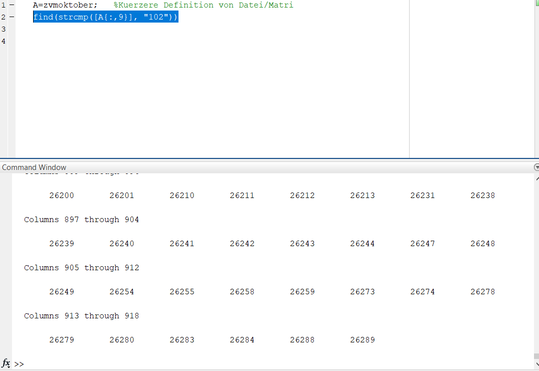 Ich habe hier mal ein Bild mit angehängt wie die Datei in Matlab aussieht, vielleicht hilft das weiter. Ich war nämlich bisher auch nimmer nur so weit, dass er nichts findet, aber es sist die 102 ja wirklich in der Spalte....irgendwie funktioniert da noch was nicht richtig....