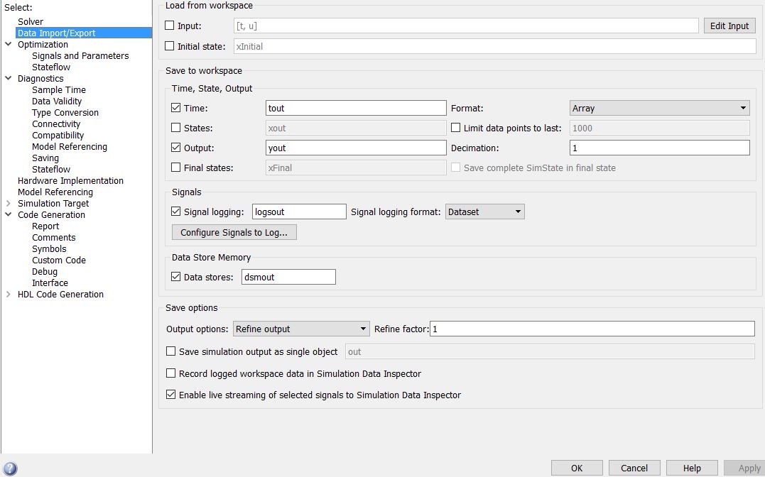 Um noch auf deinen Vorschlag einzugehen: Würde es, abgesehen davon, dass ode45 und ode4 in Simulink ein anderes Verfahren verwenden, hinterher nicht auf das selbe hinaus laufen? Meine Intention war einen Zeitvorteil zu bekommen, wenn mit ode45 simuliert wird und anschließend interpoliert (ähnlich wie deval), denn während der Parameteroptimierung wird die Simulation einige Male ausgeführt und ich vermutete es wird einen deutlichen Zeitunterschied ausmachen. Allerdings habe ich festgestellt, das im Fall von Simulink ode4 sogar schneller ist als ode45 (ohne deine Einstellungen für vorgegebenes tspan). Bei ode45 wird sogar ein Step mehr genommen als mit ode4, und hinterher die selbe Schrittweite wie bei ode4, was wohl damit zu tun hat, dass das Eingangssignal dem vom realen System entspricht und das zu festen Abtastwerten existiert. Dazu muss gesagt werden, dass das selbe System mit ode45 in Matlab deutlich schneller ist, als ode4.
