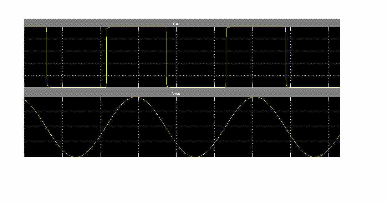 Ich habe ein System dem eine Sinusfunktion als Eingang dient. Jedes Mal wenn die Sinusfunktion die x-Achse schneidet soll eine arctan-Funktion generiert werden, die bei 1 beginnt dann gegen Null geht und anschließend sofort wieder auf 1 ansteigt. Bis jetzt habe ich nur folgendes geschafft (siehe Bild: Signale). Die fallende Flanke der arctan-Funktion wird ebenfalls erst beim Nulldurchgang der Sinusfunktion generiert. Sie soll aber unmittelbar auf die steigende Flanke folgen.