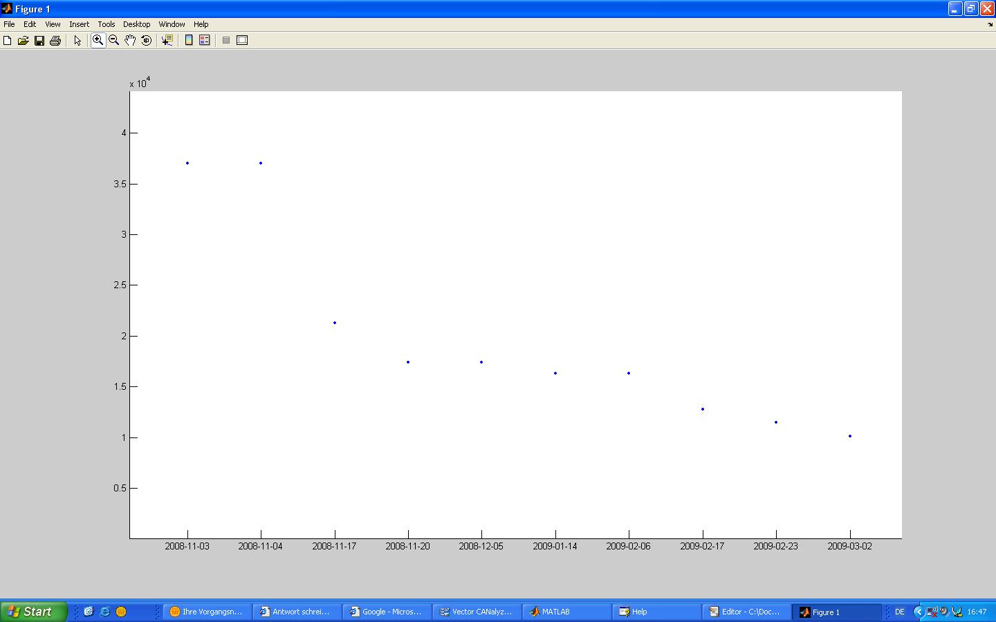Gibts in Matlab irgendeine Funktion, die die xAchse bezogen auf die Zeit normiert? Denn die Punkte müssten ja eigentlich verschiedene Abstände haben wegen der ungleichmäßigen Daten.