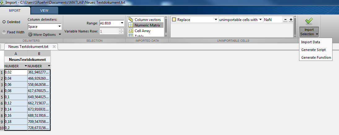 Dann erhälst du eine 10x2 double Matrix. Du kannst dir sogar den Importcode erzeugen lassen, um ihn als Funktion zum Einlesen weiterer Files zu verwenden.