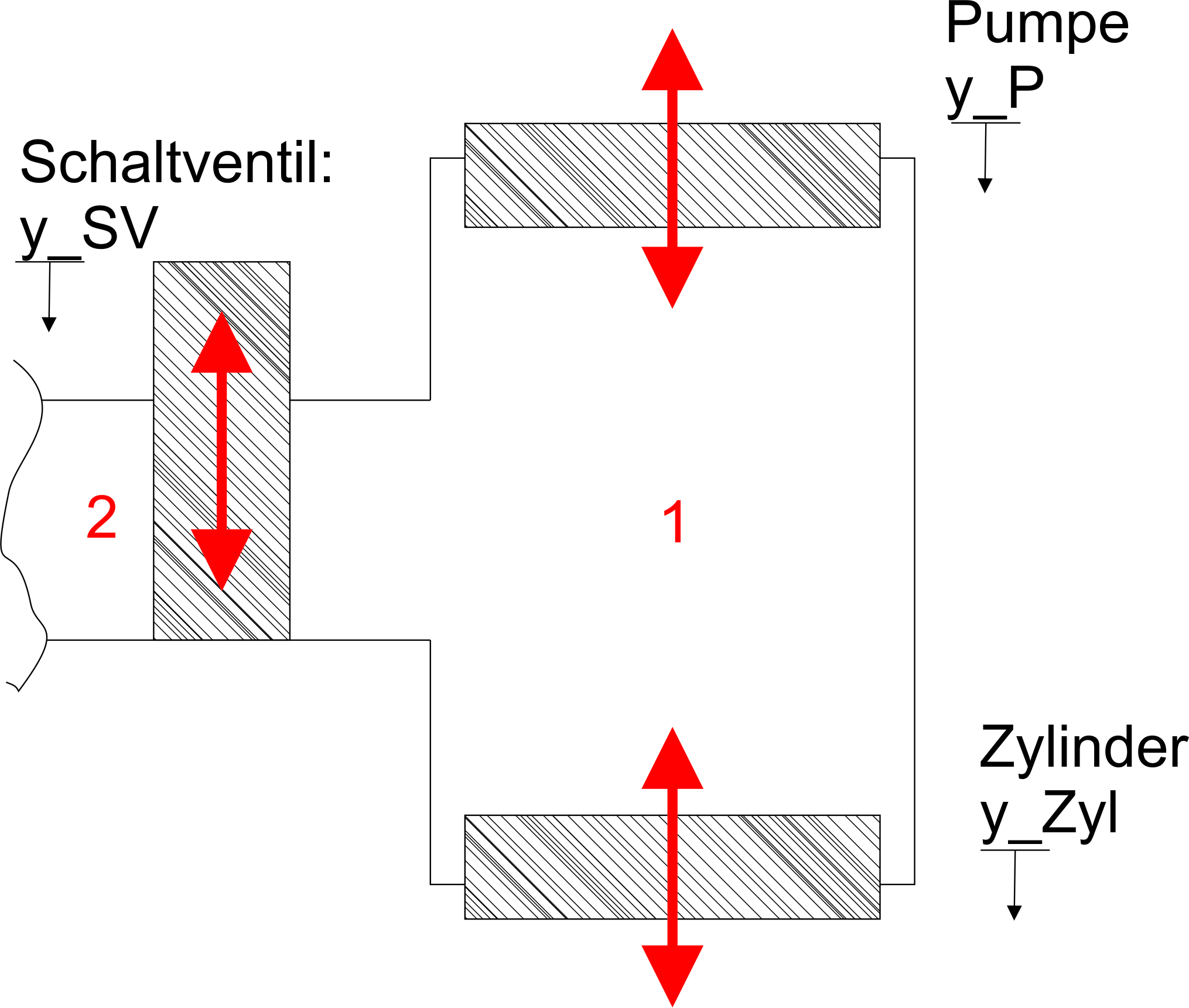 Die Pumpe ist Zylinder der sich nach oben und unten Bewegt. In dem Fall in dem das Schaltventil geschlossen ist - wie im Bild - wird durch die Bewegung der Pumpe nach unten ein Druck in Kammer 1 aufgebaut. Durch den Druckaufbau bewegt sich der untere Zylinder nach unten. Bewegt sich die Pumpe nach oben eben entsprechend andersherum.