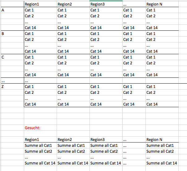 Ich suche also immer die Summe über eine bestimmte Kategorie innerhalb einer Region (Spalte) und bin mir unsicher wie ich dies für eine sehr große Matrix hinbekomme. Ich denke ich müsste zuerst definieren, dass es 14 Kategorien gibt? Und dann sagen, dass jeweils die erste Category innerhalb einer Spalte aufaddiert werden soll sowie die zweite etc.
