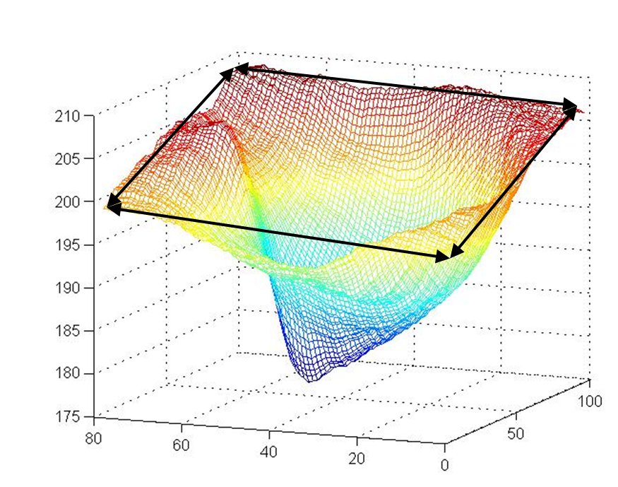ich hänge grad an der interp2 Funktion von Matlab. Im Anhang hab ich Euch ein Ausschnitt meines Bildes mitgeschickt. Dieser Ausschnitt stört mich aber und ich möchte lediglich die 4 Eckpunkte angeben und dann soll durch diese 4 Punkte eine Art 2D Parable durchgelegt werden. Ich ginge davon aus das sich das mit Interpolation 2. Ordnung lösen liese, allerdings komme ich nicht weiter. Laut der Matlab Hilfe kann ich ja eine bestehende durch Interpolation zwischen den einzelnen Werten aufblasen. Mein Vorhaben lässt sich allerdings nicht realisieren.