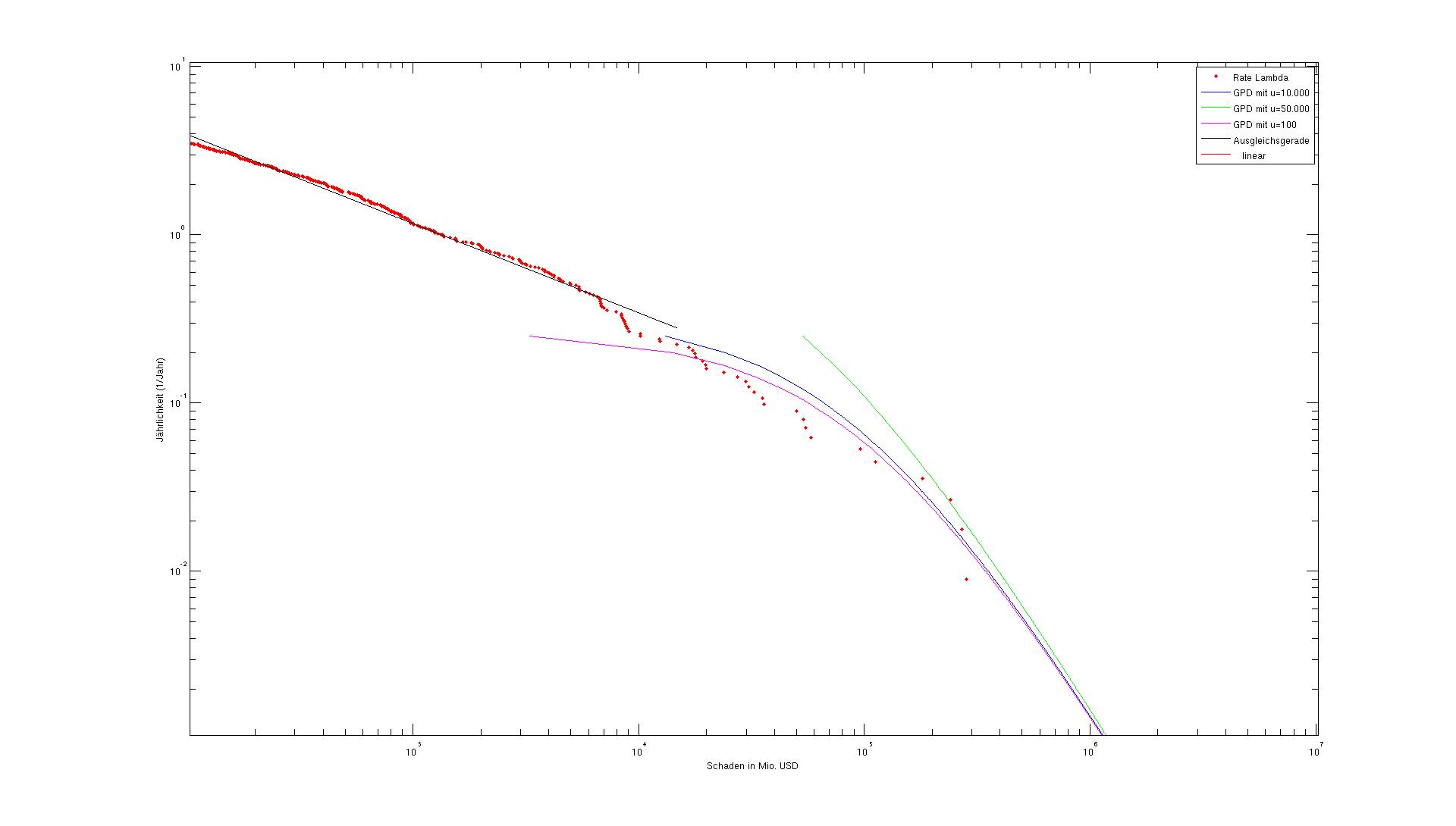 legend('Rate Lambda','GPD mit u=10.000', 'GPD mit u=50.000','GPD mit u=100', 'Ausgleichsgerade');